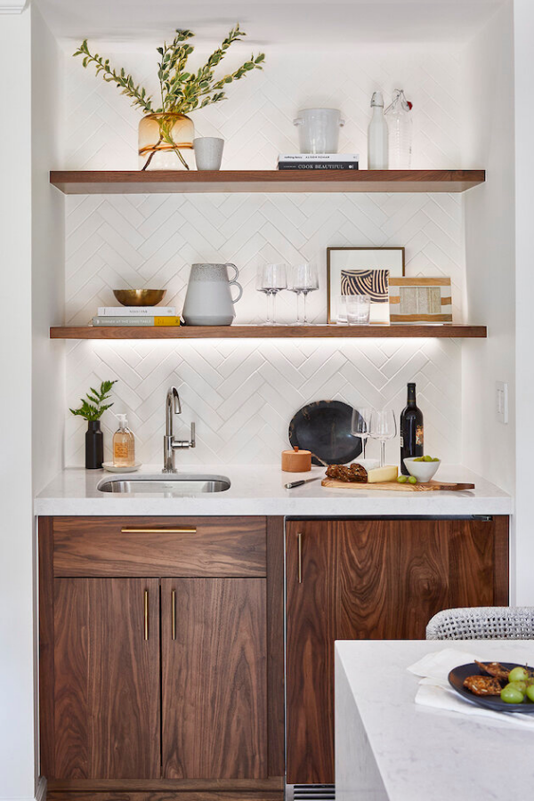 Warm and modern wet bar design in Millbrae. Design: Eggshell Home